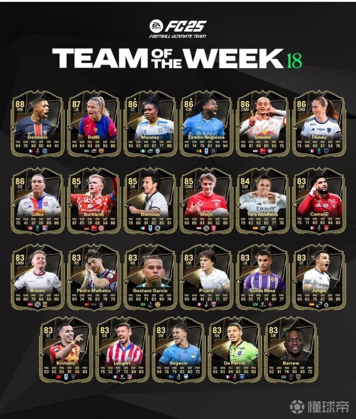 FC25的第18周黑卡名单中,豪华阵容让球迷们躁动不安。奥斯曼-登贝莱以88的评分稳坐榜首,展现出了他出色的技术和稳定的表现。紧随其后的有罗尔弗、蒙黛、安古伊萨等球员,他们在各自位置上展现出出色的能力和表现,堪称是本赛季的佼佼者。